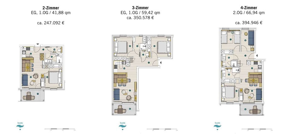 hochwertiger Einbauküche, inszenieren die Grundrisse die Aussicht: Balkone und Wohnzimmer aller Apartments sind zum Wasser orientiert und blicken auf die Marina oder das Meer. Ankommen und